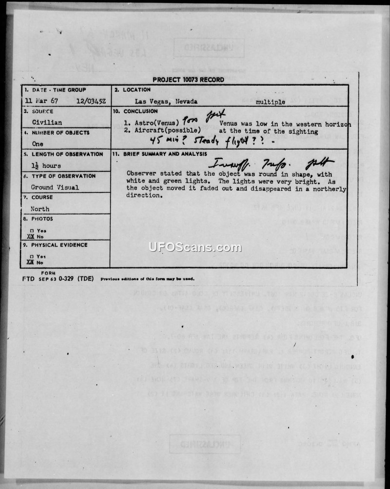 Project 10073 Record and Staff Message Branch Incoming Message regarding UFO Reports in Las Vegas, Nevada