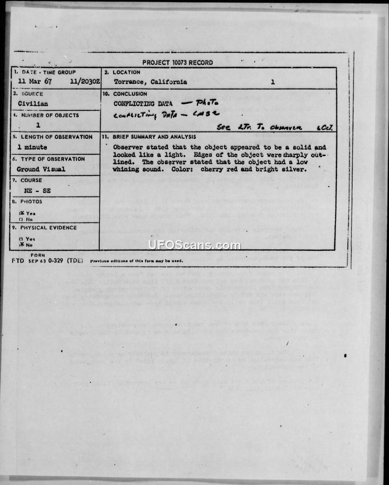On March 11, 1967, four youths in Torrance, California, reported observing an unidentified aerial object while at the Carl Steele Playground. The witnesses, including Robert R. Howard and Rick Gerety, described the object as a solid, oval-shaped craft that appeared cherry red and bright silver. They reported that the object emitted a low, whining sound and moved from North to South before disappearing into a cloud. The observation lasted approximately one minute. The witnesses took photographs of the object using a Brownie Hawkeye camera. Following the sighting, the witnesses contacted the Air Force and the local newspaper, the Daily Breeze. The case was subsequently investigated by the Foreign Technology Division (FTD) under Project Blue Book. The FTD requested the original negatives for analysis. However, the photographic evidence provided by the witnesses was deemed suspicious. Analysis by the FTD revealed that the transparencies were not original negatives; they were likely enlargements. Furthermore, the film type (Verichrome Panchromatic) was black and white, whereas one of the transparencies was in color. The FTD also noted that the cut of the transparencies did not match the standard 127 film size used in the camera described. Due to these discrepancies, the Air Force officially filed the case under the category of 'Conflicting Data.' Correspondence between the witnesses and the Air Force continued through the summer of 1967, with the witnesses expressing reluctance to hand over the negatives, citing advice from friends, including a member of N.I.C.A.P. and a person identified as Elvis Presley. The Air Force maintained that further analysis was impossible without the original negatives.