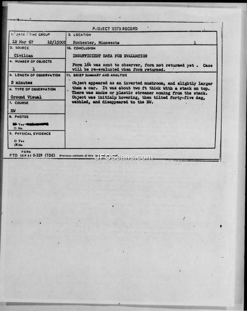 On March 12, 1967, at approximately 1500Z, a twelve-year-old boy named Mark Hrubetz observed an unidentified flying object in Rochester, Minnesota. The witness, who was at his home, described the object as an inverted mushroom, slightly larger than a car, and approximately two feet thick with a stack on top. He noted that smoke or a plastic-like streamer was emanating from the stack. The object was initially observed hovering about twenty-five to thirty feet above the ground. It subsequently tilted forty-five degrees, wobbled, and disappeared toward the northwest. The entire observation lasted approximately two minutes. The witness took three photographs of the object using a camera he had won in a contest. The Rochester Post Bulletin published one of the photographs, and the images were briefly in the possession of a local television announcer, Gary Petersen. The Air Force initiated an investigation under Project 10073, but the initial conclusion was that there was insufficient data for evaluation. The Air Force requested the original negatives and specific camera data from the witness to conduct a comprehensive photographic investigation, but the case remained pending as of the date of the correspondence.