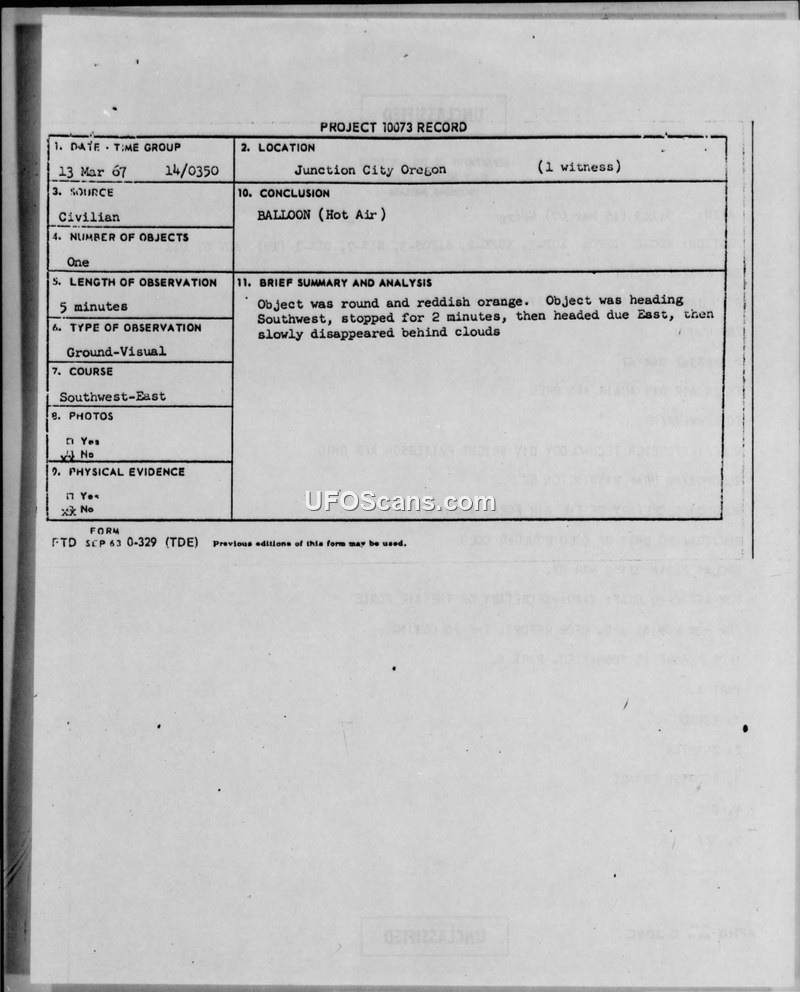 Project 10073 Record — Sighting Report, 13 March 1967, Junction City, Oregon