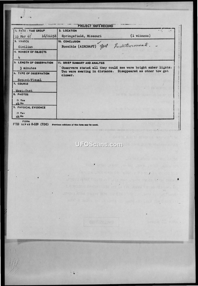 A 19-year-old witness reported four bright amber lights in Springfield, Missouri, on March 15, 1967. The Air Force investigation found no radar confirmation and concluded the incident was indeterminate.