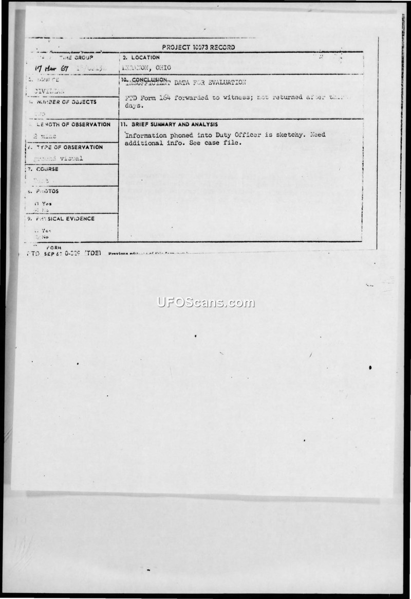 Project 10073 Record: UFO Observation, 17 March 1967