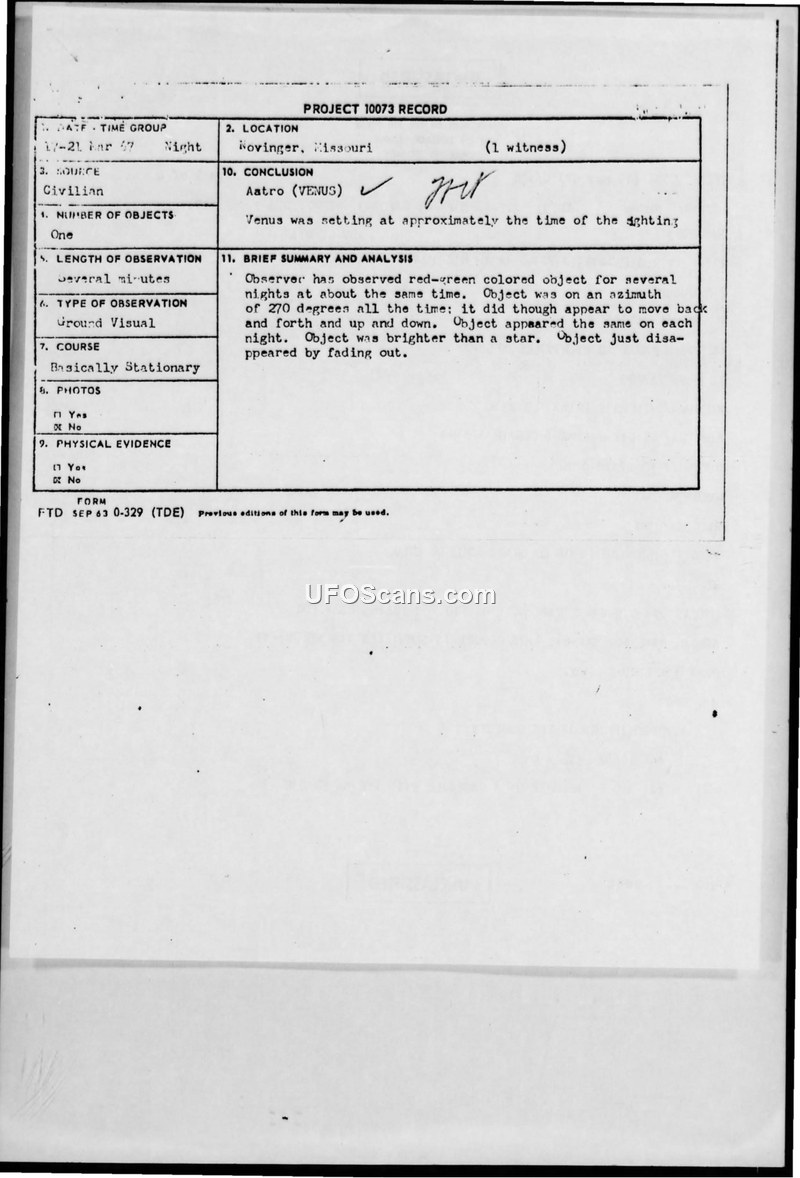 A civilian in Novinger, Missouri, reported a stationary, red and green light in March 1967. The Air Force investigation concluded the object was the planet Venus.