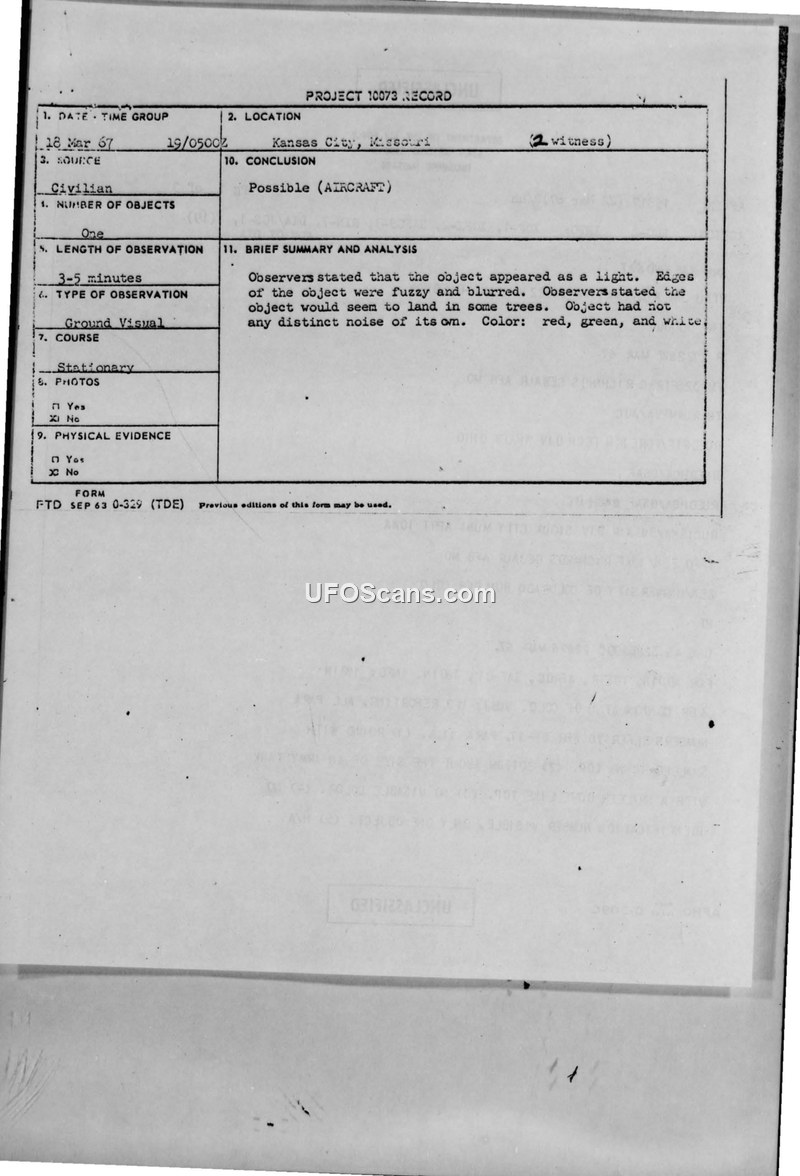 Project 10073 Record — Kansas City, Missouri, 18 March 1967
