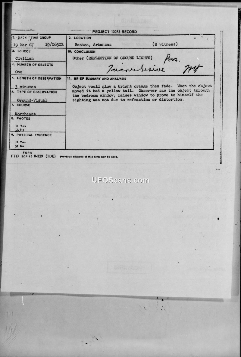 This document is a Project 10073 record concerning a UFO sighting reported on 19 March 1967 in Benton, Arkansas. The report details an incident involving two witnesses who observed a large, egg-shaped, bright orange object with a yellow tail. The object was seen through a bedroom window, and the observer reportedly raised the window to ensure the sighting was not caused by refraction or distortion. The observation lasted approximately three minutes, with the object moving northeast at an elevation of 45 degrees before slowly fading from sight. The Air Force investigation, conducted by Assistant Base Operations Officer Metheu F. Lewkowski, included a conversation with a Mrs. Morrison. The official conclusion reached by the Air Force was that the sighting was likely a reflection of ground lights on low clouds, possibly from a searchlight. Little Rock Approach Control radar confirmed no unusual traffic or activity in the area at the time of the sighting. The witnesses were described as laborers with poor reliability.