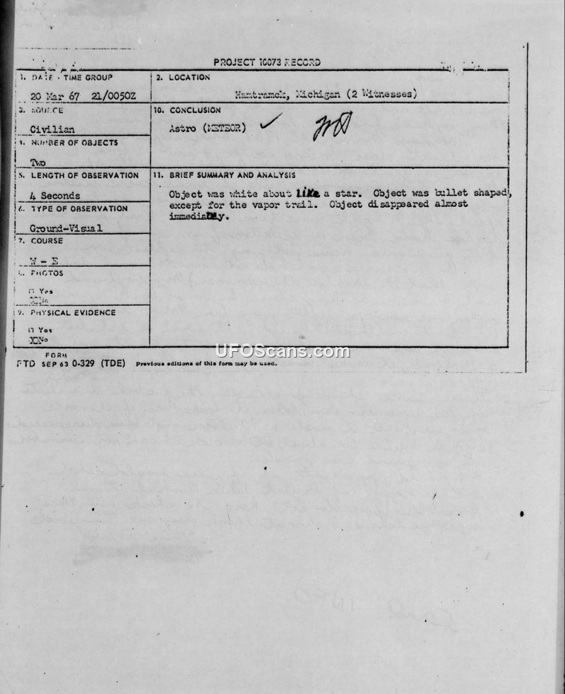 A 12-year-old witness reported a sighting of two bullet-shaped objects in Hamtramck, Michigan, on March 20, 1967. The Air Force classified the event as a meteor.