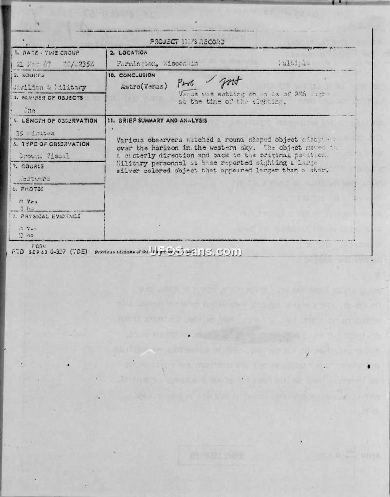 A March 1967 UFO sighting in Farmington, Wisconsin, involving a round, red-orange object, was officially identified by the Air Force as the planet Venus. Radar checks at the 674th Radar Squadron yielded no corroborating data.