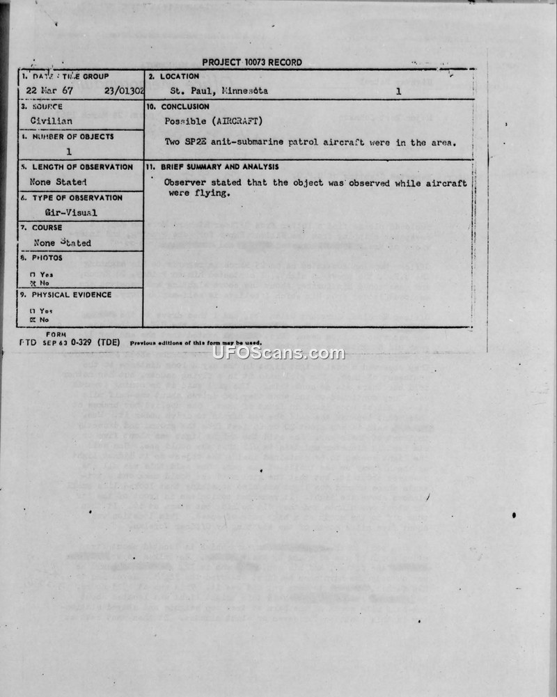 A series of U.F.O. sightings in Minnesota on March 22, 1967, were investigated by the Minnesota Highway Patrol and the U.S. Air Force. The Air Force concluded the sightings were likely caused by the high-intensity search lights of SP2E anti-submarine patrol aircraft.