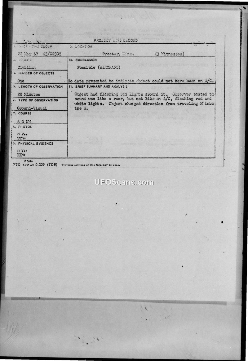A 66-year-old woman in Proctor, Minnesota, reported a 20-minute sighting of a round, flashing, roaring object on March 22, 1967. The Air Force classified the event as a 'Possible (AIRCRAFT)' sighting due to insufficient data.