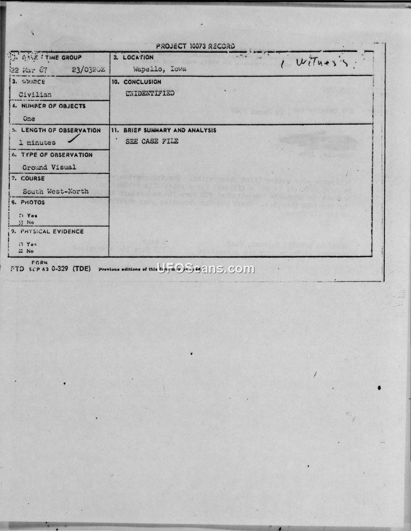 Project 10073 Record: UFO Observation, 22 March 1967, Wapello, Iowa