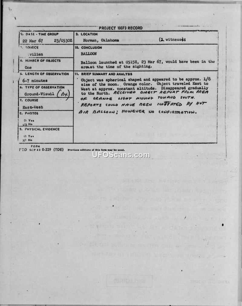 Project 10073 Record: UFO Observation, 22 March 1967, Norman, Oklahoma