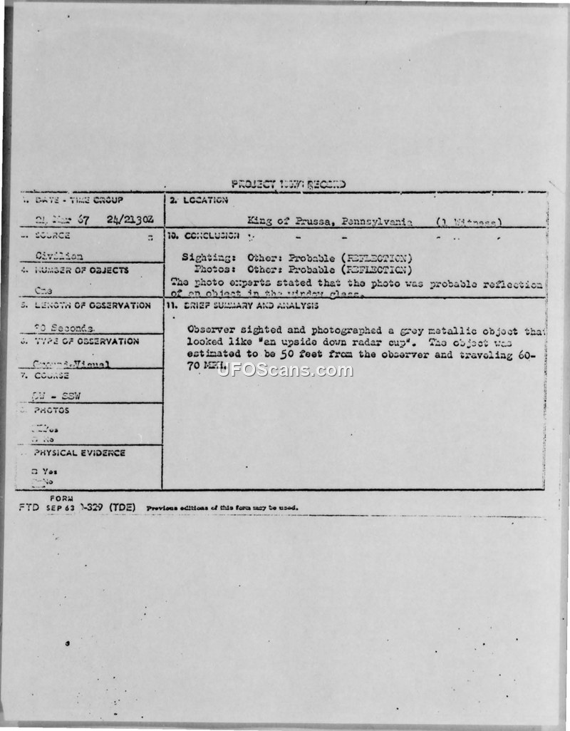 UFO Observation & Photograph, March 24, 1967 — King of Prussia, Pennsylvania