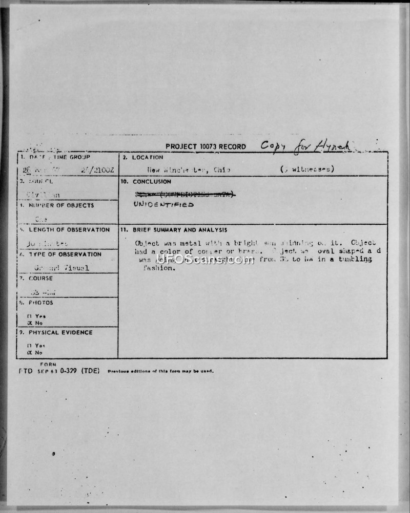 A metallic, oval-shaped object was observed by multiple witnesses in New Winchester, Ohio, on March 26, 1967. The object, described as copper or brass in color, moved in a tumbling fashion for 20-30 minutes before the case was officially classified as 'UNIDENTIFIED' by Project Blue Book.
