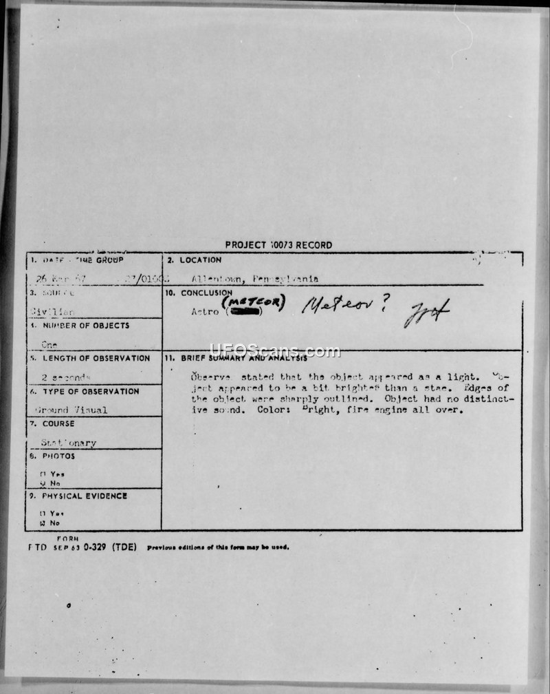 Project 10073 Record — Sighting Report, Allentown, Pennsylvania, 26 March 1967