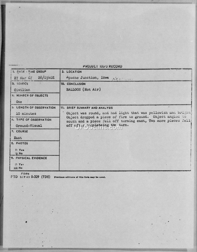 Military reports from March 1967 describe UFO sightings in Arizona that were officially identified as homemade hot air balloons constructed by children using plastic bags and candles.