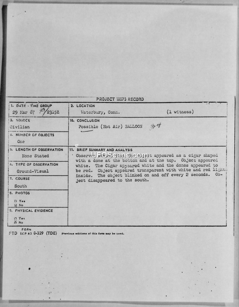 A 16-year-old witness in Waterbury, CT, reported a cigar-shaped, blinking object on March 29, 1967. The official project conclusion identified the object as a possible hot air balloon.