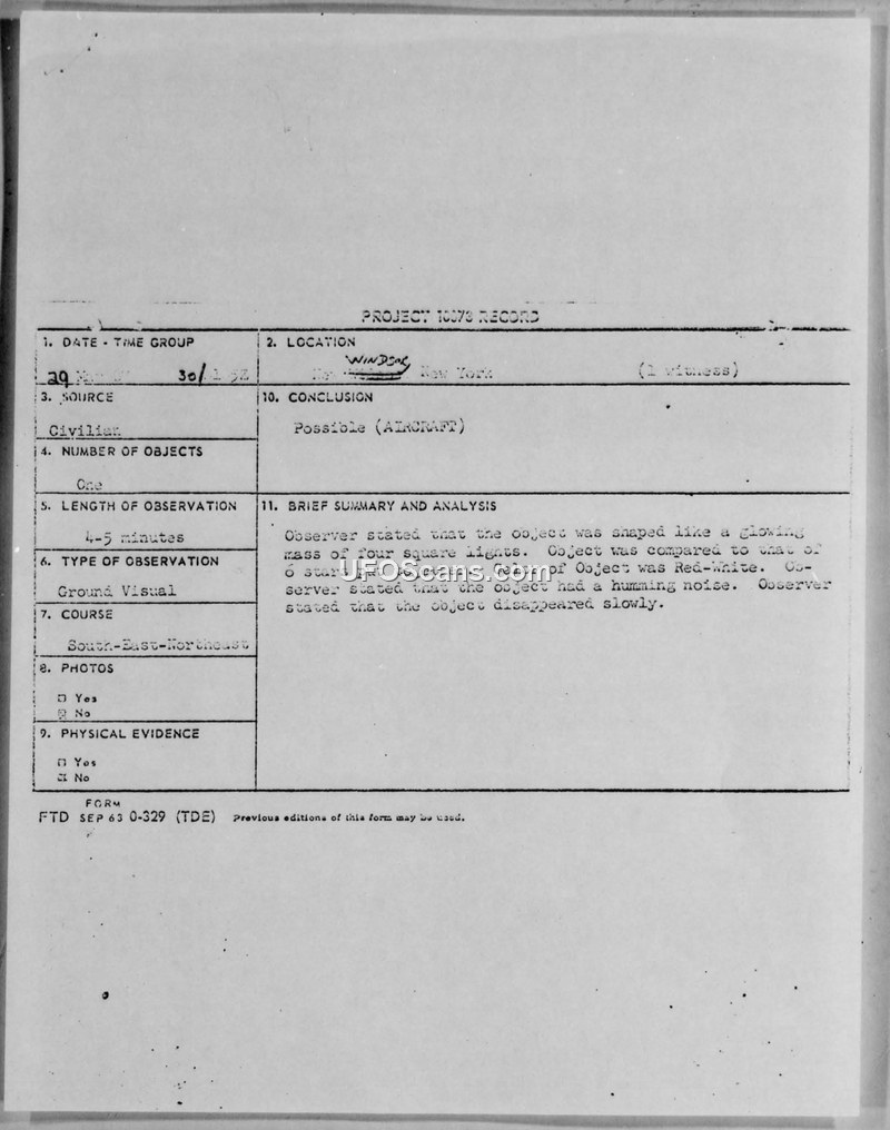 On 30 March 1967, at approximately 2005 local time, a civilian observer in New Windsor, New York, reported a sighting of an unidentified aerial phenomenon. The observer, a 12-year-old student, described the object as a glowing mass consisting of four square lights, comparable in size to six stars grouped together. The object was red and white in color and emitted a soft humming noise. The sighting lasted between four and five minutes, during which the object moved from the south to the east and then to the northeast. The weather conditions at the time were clear with calm winds and a temperature of 43°F. The report was formally submitted by Lt. Col. D. C. Boyd of the 46030 Air Base Group at Stewart Air Force Base to the Foreign Technology Division (FTD). Captain Peter M. Green, a pilot with Detachment 1 of the 4650th Combat Support Squadron, investigated the report. In his comments, Captain Green noted that the observer, identified in the report as Edward Grant, had likely witnessed one of the local Stewart AFB aircraft that were operating in the area during that time period. The official conclusion reached by the investigating officer was that the sighting was an aircraft. The observer's reliability was assessed as poor.