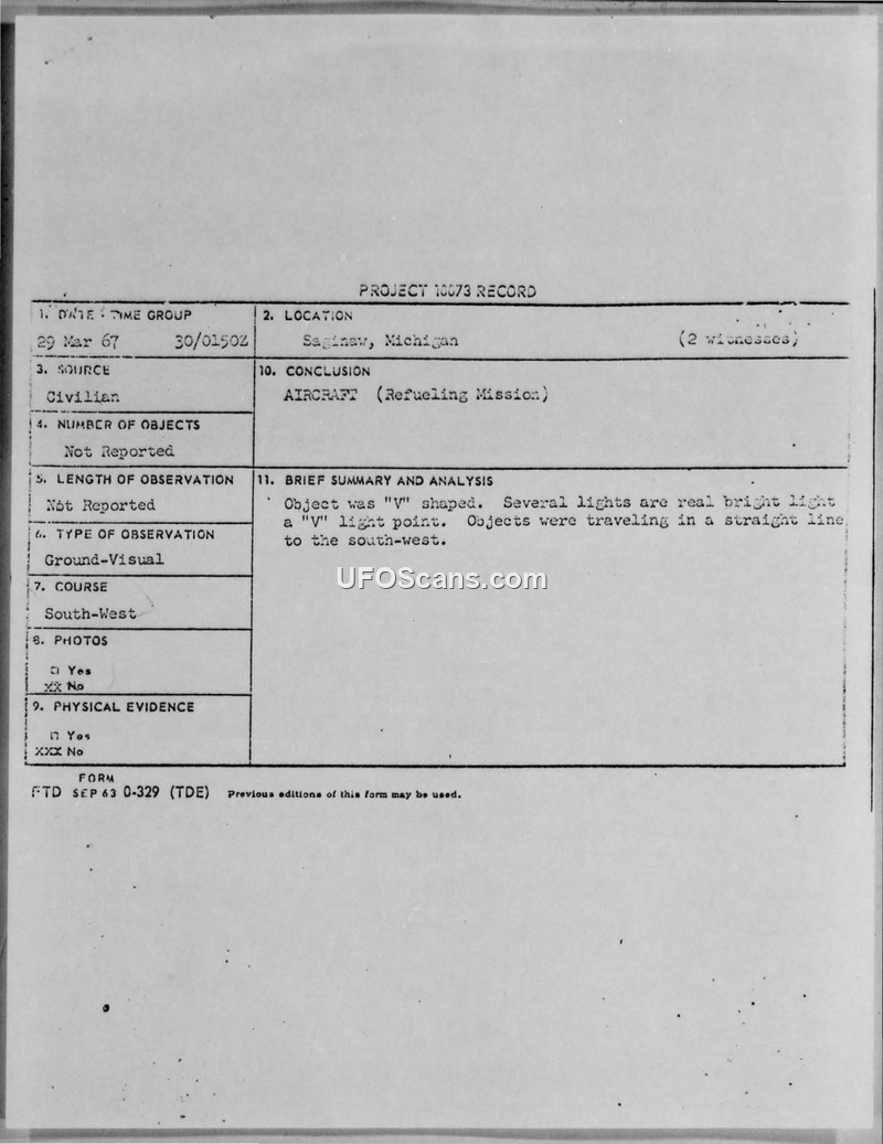 Project 10073 Record: UFO Sighting, Saginaw, Michigan, 29 March 1967