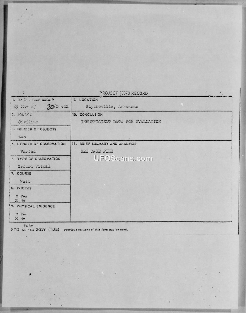 A civilian in Blytheville, Arkansas, reported three UFO sightings on March 29, 1967. The Air Force concluded the evidence was insufficient for evaluation.