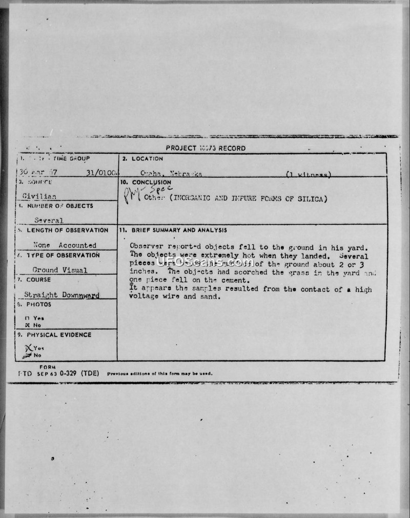 The Air Force investigated physical specimens found in Omaha, Nebraska, in 1967. Laboratory analysis determined the objects were fused silica caused by high-voltage electrical contact, not extraterrestrial in origin.