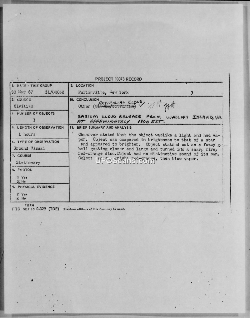 Project 10073 Record — Fultonville, New York, March 30, 1967
