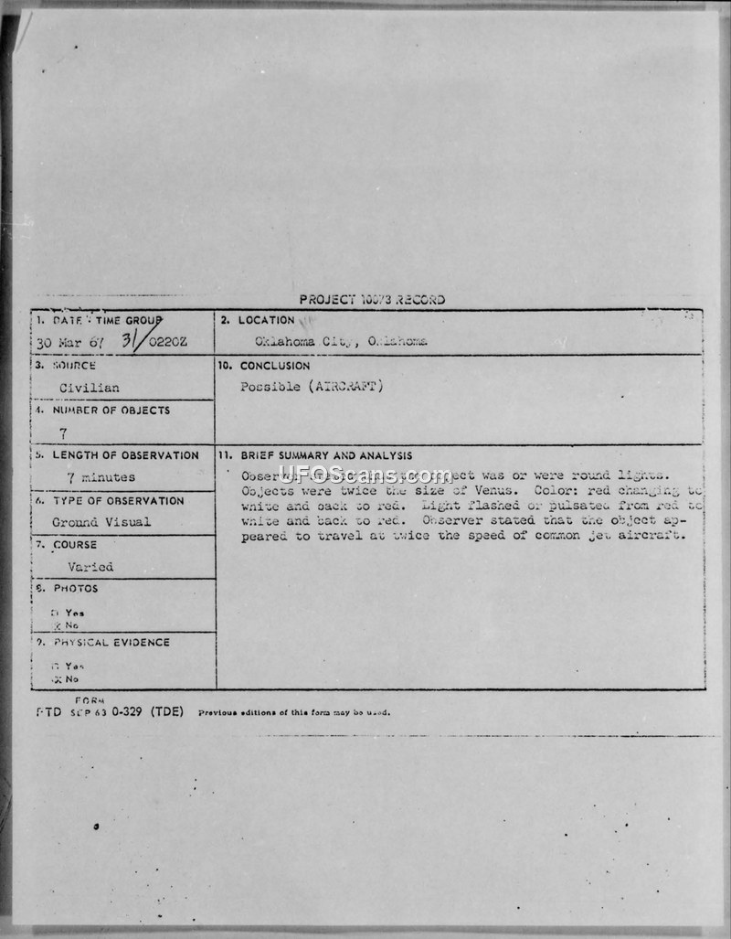 Project 10073 Record: Sighting Report, Oklahoma City, 30 March 1967