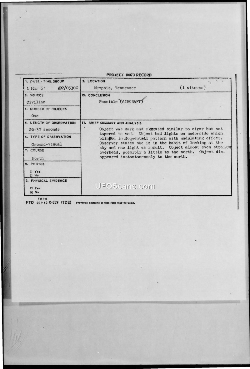 Multiple UFO sightings in Memphis, Tennessee, in March 1967 were investigated by the Air Force. The official conclusion was that the objects were likely conventional aircraft.