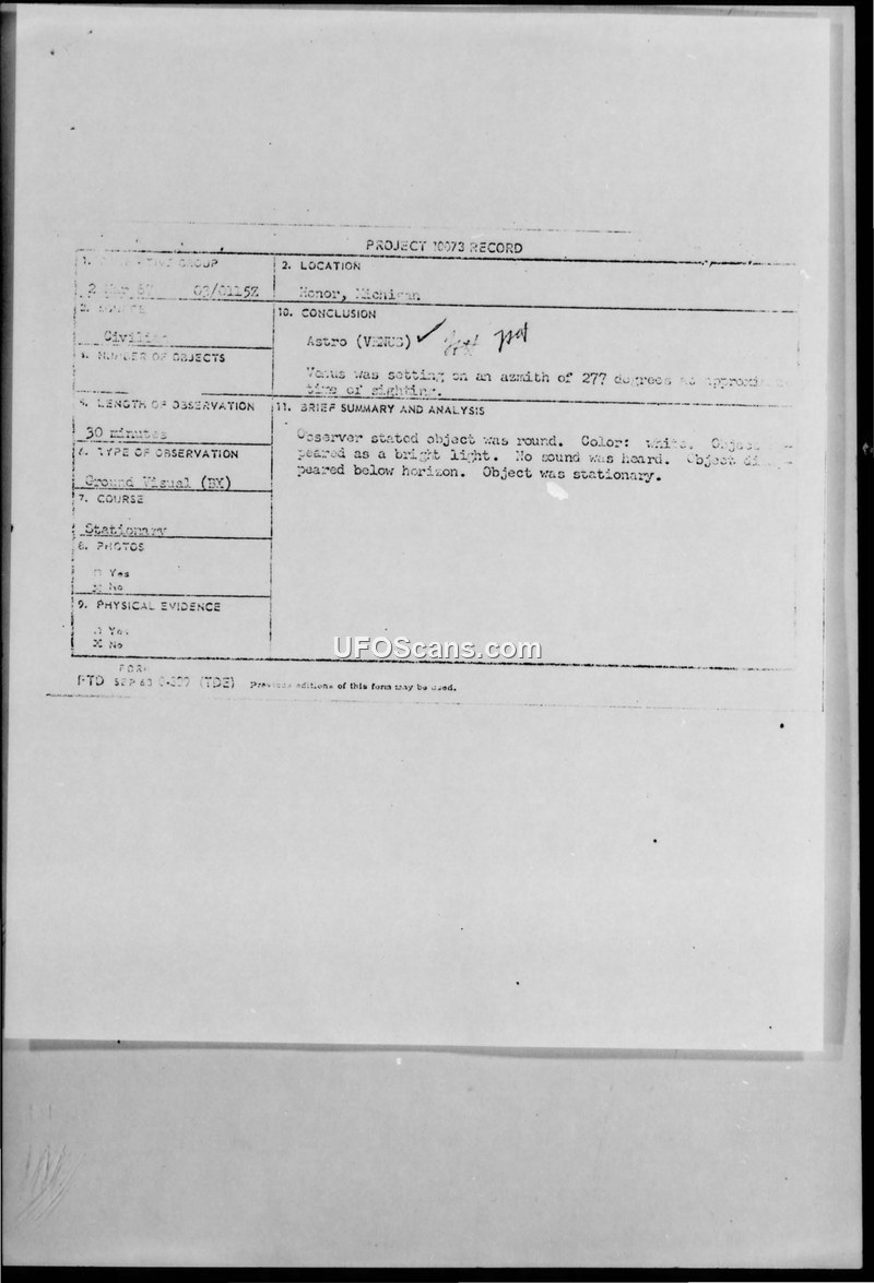 A March 1967 UFO sighting in Honor, Michigan, was investigated by the Air Force and officially attributed to a surface inversion causing the planet Venus to appear as an unidentified object.