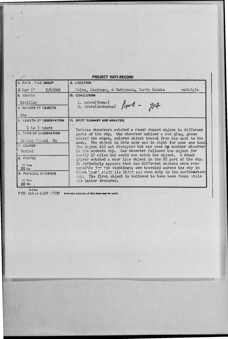 Project 10073 Record: UFO Report - North Dakota, 2 March 1967