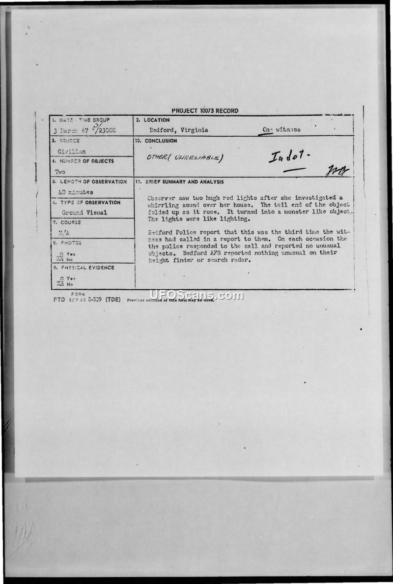 On 3 March 1967, at approximately 2300Z, a 26-year-old female witness in Bedford, Virginia, reported observing two large, red lights. The witness described hearing a whirling sound over her house, which prompted her to investigate outside. She observed that the tail end of the object folded up as it rose, at which point it transformed into a 'monster-like object.' The witness stated that the lights resembled lightning. The duration of the observation was reported as 40 minutes. The Bedford Police Department responded to the report, noting that this was the third time the same witness had contacted them regarding similar sightings. On each occasion, the police found no evidence of unusual objects. Furthermore, the Bedford Air Force Station (AFS) reported that their height finder and search radar detected nothing unusual during the time of the incident. The official Air Force record categorizes the report as 'OTHER (UNRELIABLE).' The document includes meteorological data for the area, noting clear conditions and specific temperature inversions.