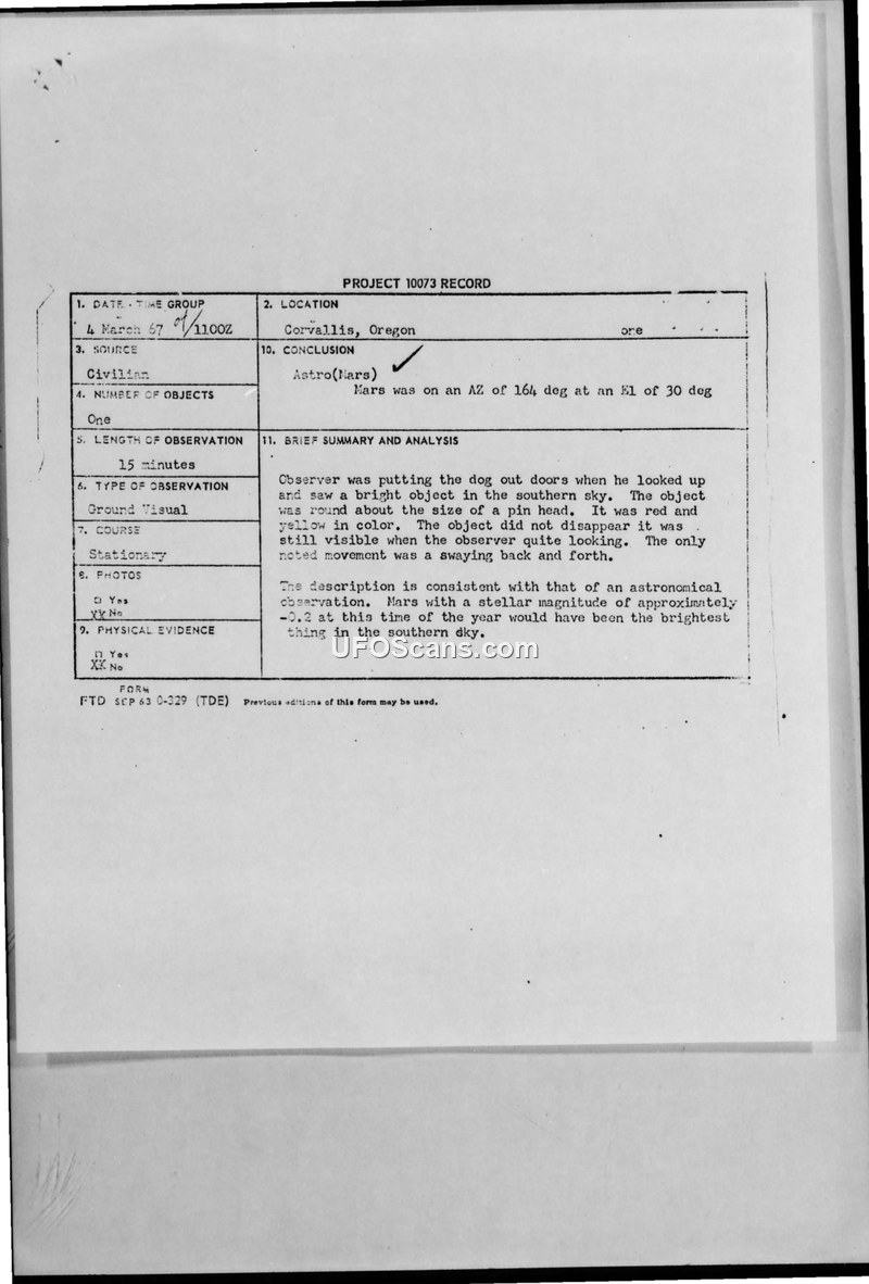Project 10073 Records and Air Force Incoming Messages — Corvallis, Oregon, March 1967