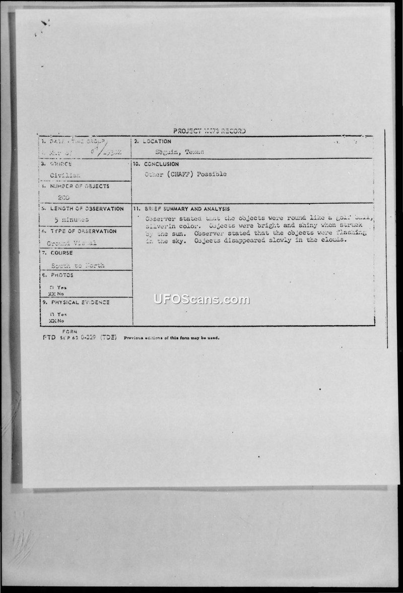 A civilian reported 200 silver, golf-ball-sized objects in the sky over Seguin, Texas, on March 4, 1967. The Air Force investigation concluded the objects were likely chaff reflecting sunlight.