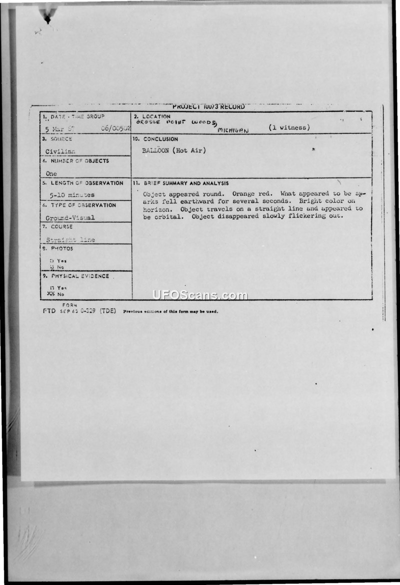 Multiple witnesses in Grosse Pointe Woods, Michigan, reported a reddish-orange aerial object in March 1967. Military investigators concluded the sightings were caused by hot air balloons, noting that photographs taken by witnesses failed to capture the object.