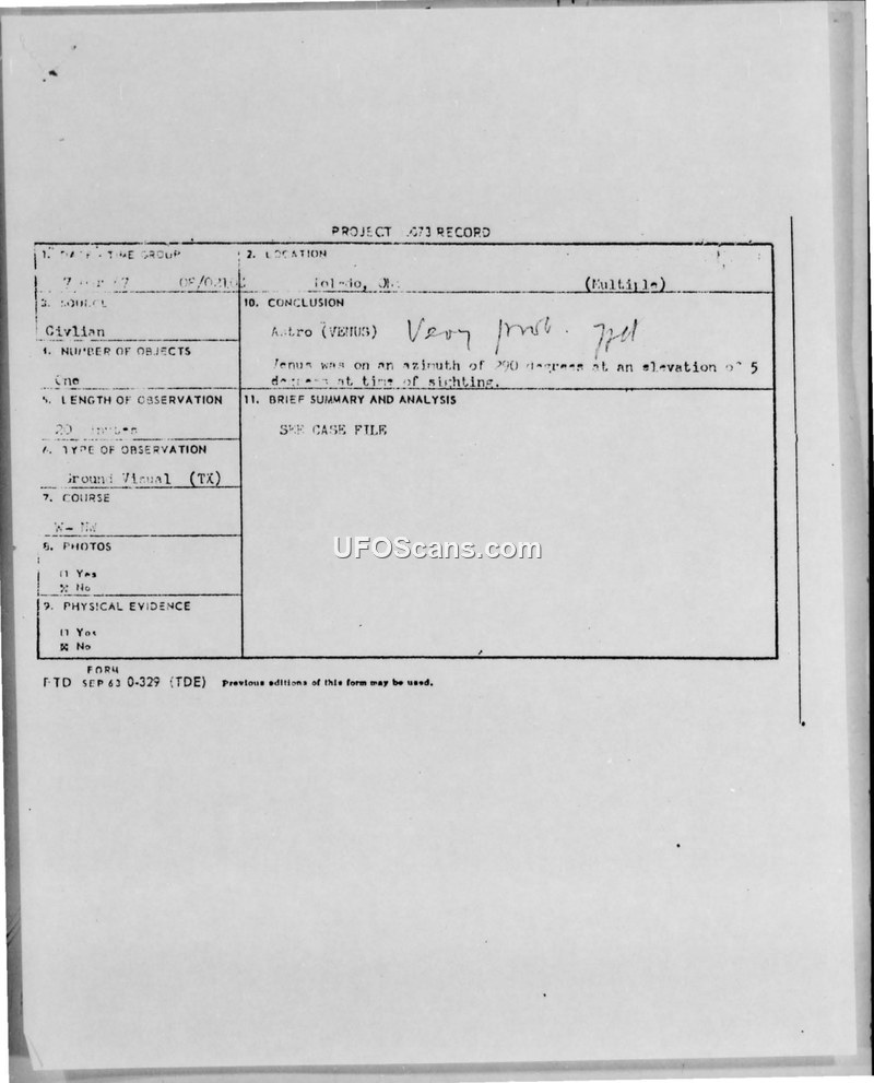 A civilian report of a UFO sighting in Toledo, Ohio, on 7 April 1967. Project Blue Book investigators concluded the object was the planet Venus.