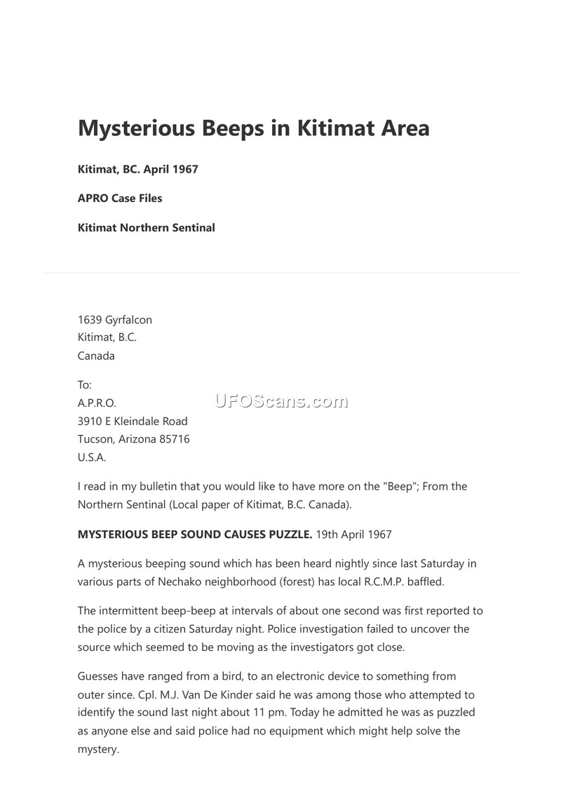 This document consists of correspondence regarding a series of mysterious events in Kitimat, British Columbia, during April 1967. The primary phenomenon reported was an intermittent, one-second interval beeping sound heard nightly in the Nechako neighborhood, which baffled local R.C.M.P. officers. Witnesses described the sound as originating from above the treetops, with some comparing it to a homing signal. A police-trained German Shepherd reportedly refused to enter the forest where the sound was emanating. Following the initial reports of the sound, residents observed unidentified aerial objects. On April 19, 1967, witnesses reported a large, hovering object displaying flashing blue, red, green, and white lights over the Alcan Steel works. On April 20, 1967, observers reported multiple objects moving in various directions, which they distinguished from satellites. These events were accompanied by significant electromagnetic and mechanical anomalies, including a one-hour electric power failure, a fire siren activating without cause, and a fire box at the local hospital triggering a small fire. The author of the correspondence, a local resident, provided these accounts to A.P.R.O. (Aerial Phenomena Research Organization) for further investigation, noting that local authorities were unable to provide explanations for the occurrences.