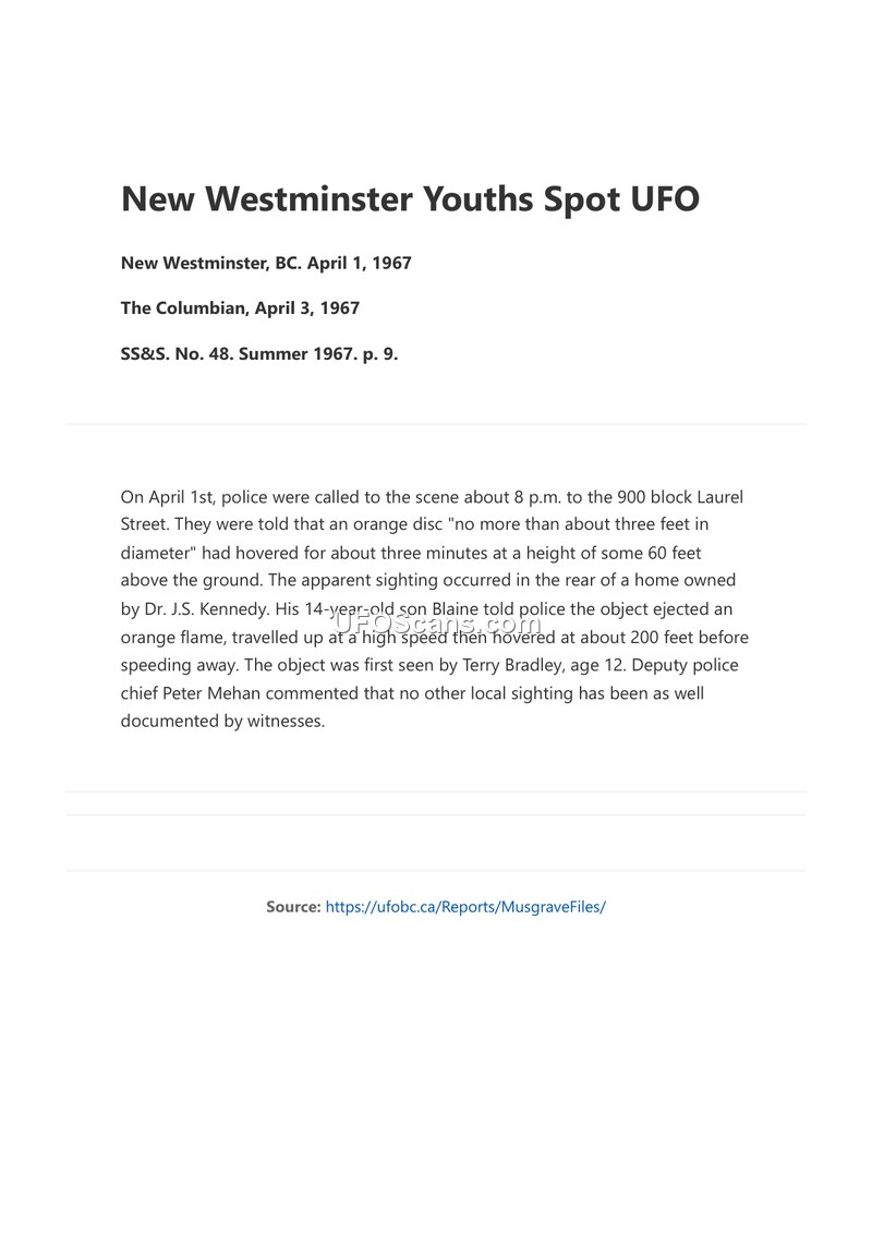 On the evening of April 1, 1967, at approximately 8:00 p.m., police in New Westminster, British Columbia, were summoned to the 900 block of Laurel Street following reports of an unidentified aerial phenomenon. The sighting took place in the rear of a property owned by Dr. J.S. Kennedy. Two youths, 12-year-old Terry Bradley and 14-year-old Blaine Kennedy, reported observing an orange disc-shaped object. According to the witnesses, the object, estimated to be no more than three feet in diameter, hovered for approximately three minutes at an altitude of 60 feet. Blaine Kennedy further described the object as ejecting an orange flame before ascending at a high speed and hovering again at an altitude of 200 feet prior to departing the area. Deputy police chief Peter Mehan noted the significance of the event, stating that it was one of the most well-documented sightings in the local area.