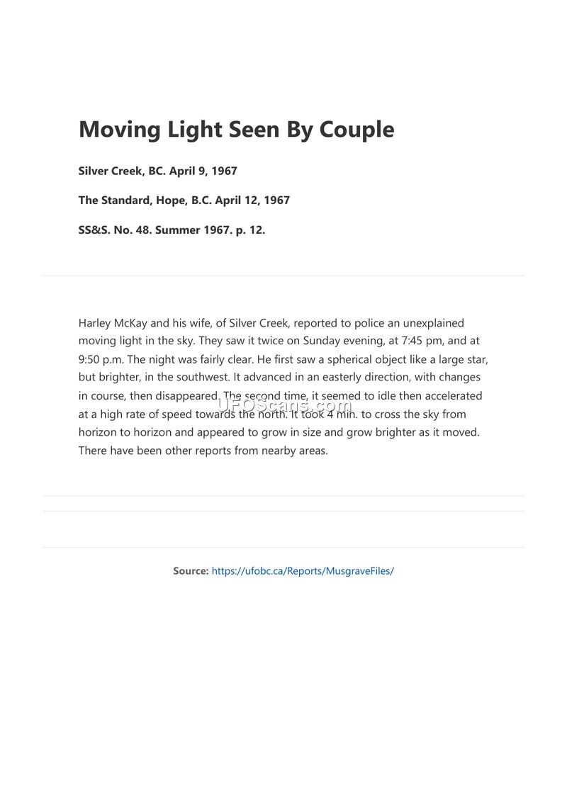 On April 9, 1967, a couple identified as Harley McKay and his wife, residents of Silver Creek, British Columbia, reported an encounter with an unexplained moving light in the sky to local police. The witnesses observed the phenomenon twice during the evening, first at 7:45 p.m. and again at 9:50 p.m. on a night described as fairly clear. During the initial sighting, the object was described as a spherical entity resembling a large, bright star located in the southwest. It moved in an easterly direction, exhibiting changes in its course before disappearing. Upon the second sighting, the object appeared to idle before accelerating at a high rate of speed toward the north. The witnesses noted that the object took four minutes to traverse the sky from horizon to horizon, during which time it appeared to increase in both size and brightness. The report concludes by noting that similar sightings had been reported in nearby areas.