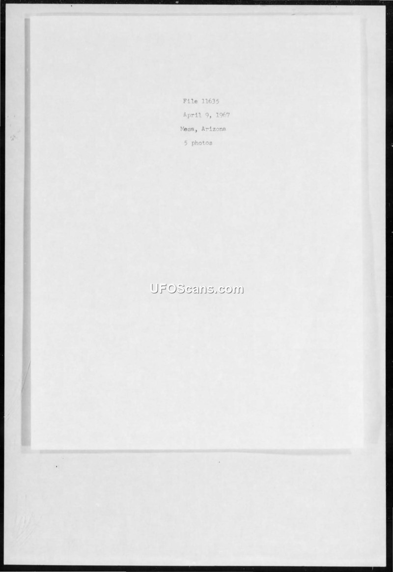 This document, identified as File 11635, serves as a record of a sighting incident that occurred in Mesa, Arizona, on April 9, 1967. The file consists of a cover page providing the date, location, and a reference to five accompanying photographs. The remaining pages of the document contain these photographic images, which appear to show light streaks or trails against a dark background, and one photograph depicting a landscape scene with trees, marked with a date stamp of 'JUN 67'. No further narrative, witness testimony, or official analysis is provided within the document.