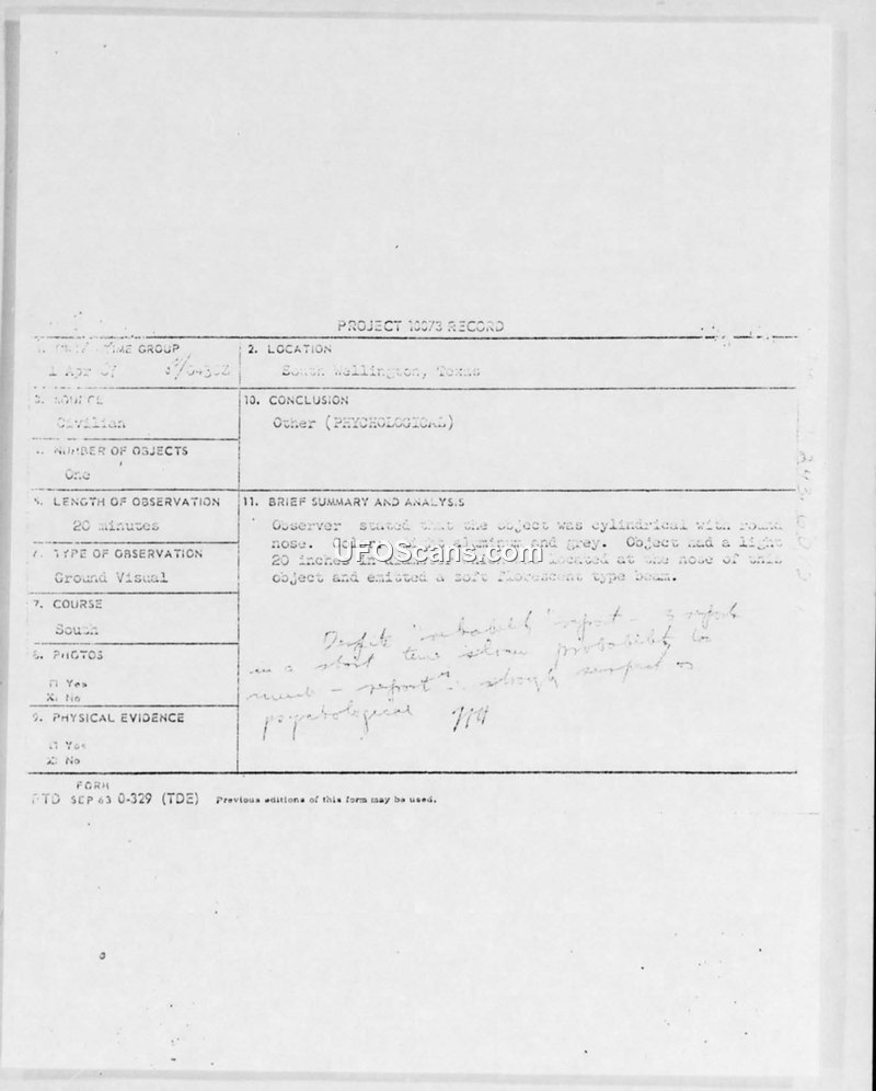 Project 10073 Record: Sighting Incident — Wellington, Texas, 1 April 1967