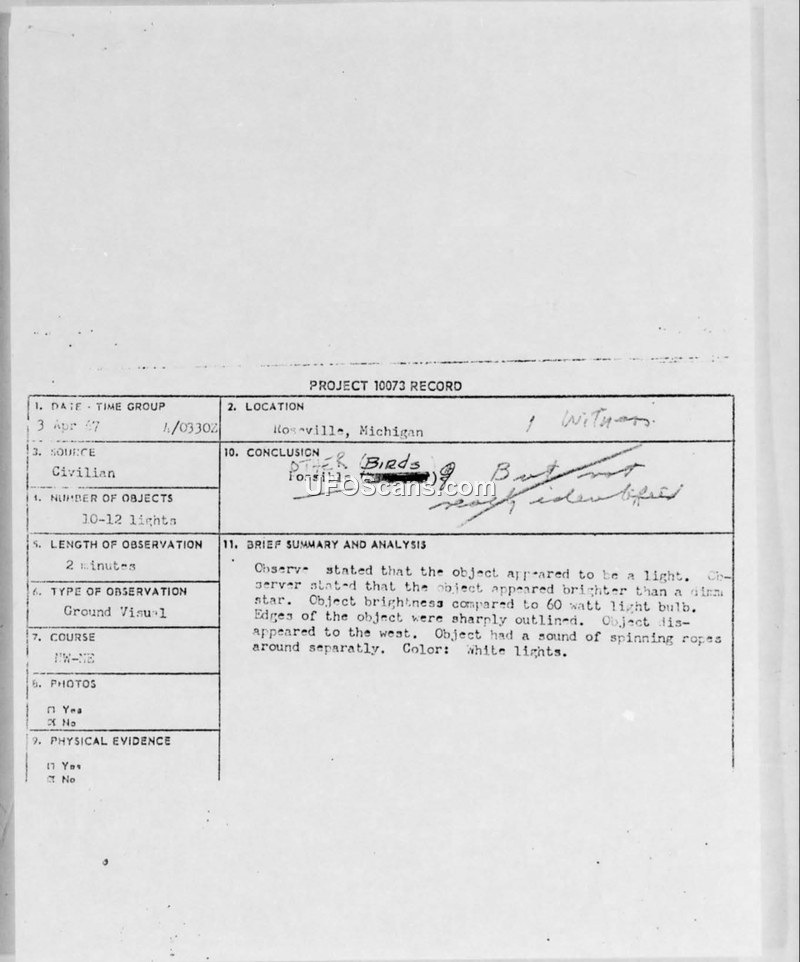 Project 10073 Record — Roseville, Michigan, 3 April 1967