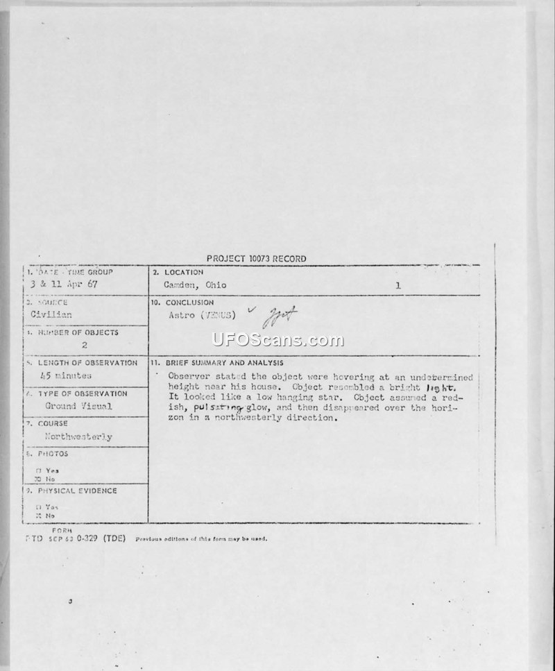 A civilian reported a UFO sighting in Camden, Ohio, in April 1967. The Air Force concluded the object was the planet Venus.