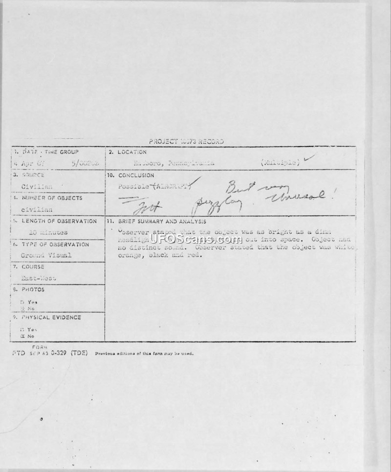 A 13-year-old witness reported a multi-lighted aerial object in Hatboro, Pennsylvania, on April 4, 1967. The Air Force determined the report provided insufficient data for scientific evaluation.