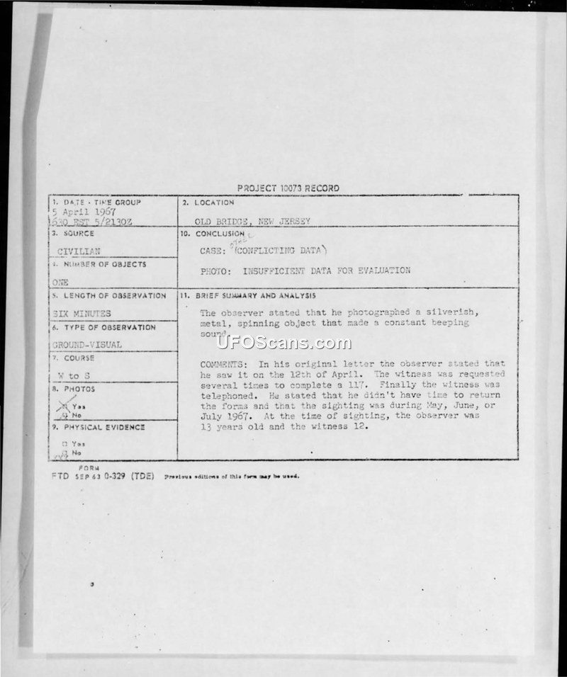 Project 10073 Record — Old Bridge, New Jersey, 5 April 1967