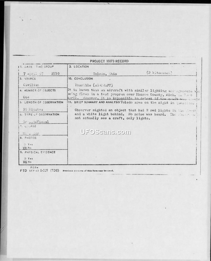 Project 10073 Record — Toledo, Ohio, 7 April 1967