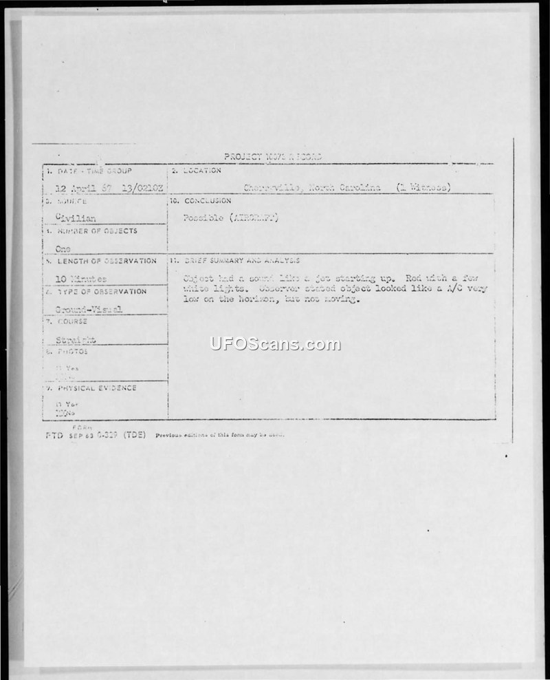 Project 10073 Record — Sighting Report, Cherryville, North Carolina, 12 April 1967