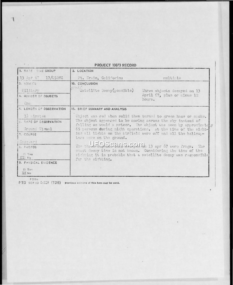 Project 10073 Record — Sighting at Ft. Irwin, California, 13 April 1967