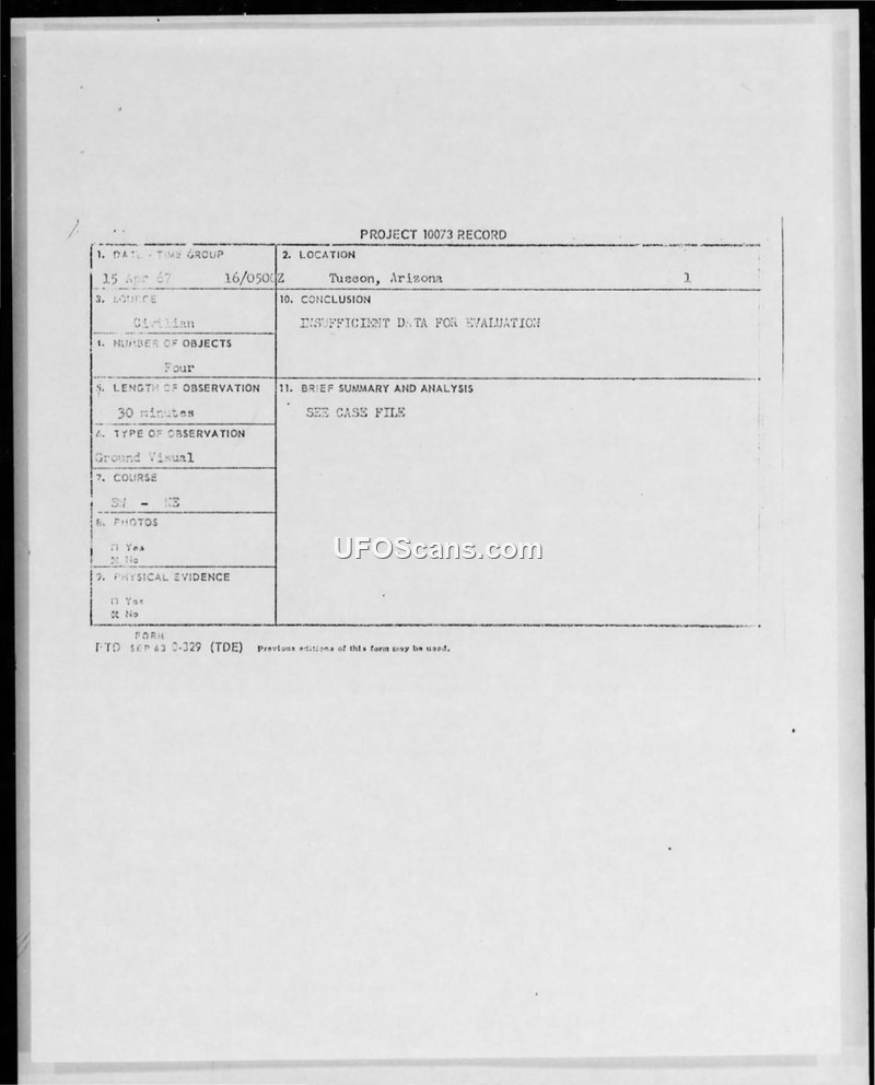 This document archive contains correspondence and records related to UFO sightings reported to the U.S. Air Force in April 1967, specifically under the umbrella of Project Blue Book and Project 10073. A primary case involves a sighting in Tucson, Arizona, on April 15, 1967, where a civilian reported four objects observed for 30 minutes. The Air Force response to this and other inquiries, such as those from Lazar Keitelman of the Scientific Phenomena in Our Atmosphere Investigations Committee, consistently states that the data provided is insufficient for a definitive conclusion. The Air Force emphasizes the need for essential data like flight characteristics, angular velocities, and maneuvers, and advises witnesses to report sightings immediately to the nearest military installation for on-the-spot investigation. The archive also includes internal memos, such as a routing slip from 'Becky' to 'Marilyn' regarding a reply to a citizen, and a list of sightings from April 16-23, 1967, which categorizes various reports as aircraft, balloons, or insufficient data. The tone of the Air Force correspondence is formal and dismissive of the possibility of extraterrestrial origin, maintaining that no scientific evidence has been presented to support such claims.