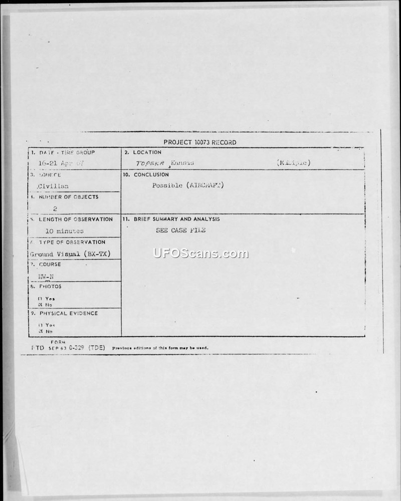 A civilian in Topeka, Kansas, reported observing two white, accelerating objects for 10 minutes in April 1967. The U.S. Air Force concluded the objects were possibly aircraft.