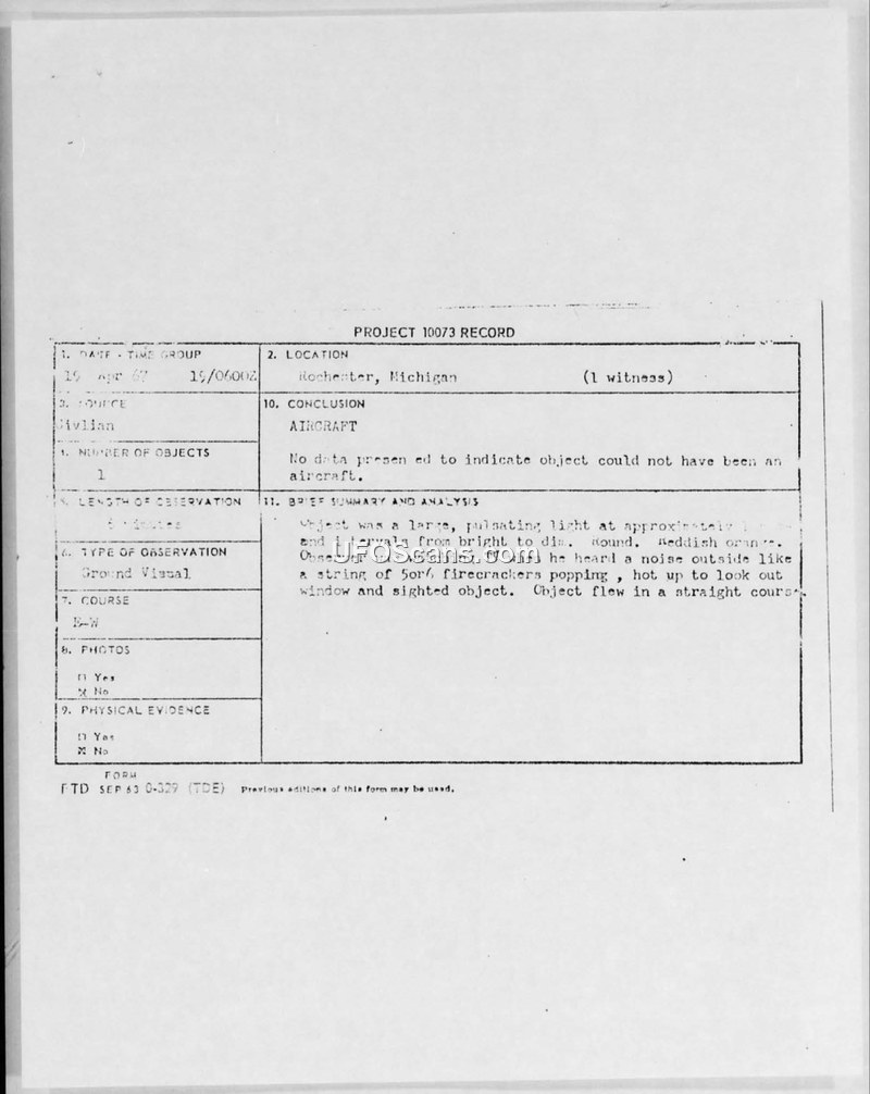 On 19 April 1967, at approximately 0100 hours local time, a female witness in Rochester, Michigan, observed an unidentified aerial phenomenon. The witness, a housewife with a college education, was watching television when she heard a noise outside described as a string of five or six firecrackers popping. Upon looking out the window, she sighted a large, round, reddish-orange light. She subsequently awakened her 19-year-old son, and together they observed the object as it moved steadily from east to west until it disappeared behind houses and trees. The observation lasted approximately five minutes. The witness described the object as pulsating at one-second intervals, changing from bright to dim. She noted that the object moved slowly, at an estimated speed of 5 to 10 miles per hour, and appeared to be approximately 200 yards away. The witness stated that the object's steady, purposeful movement convinced her and her son that it was a controlled vehicle of some kind. The report was investigated by Major R.W. Nyls of the 1st Combat Support Group at Selfridge AFB, Michigan. The official Air Force conclusion, as stated in the report, was that there was no data presented to indicate the object could not have been an aircraft. Major Nyls specifically noted that the object's steadiness of course and description precluded the possibility of it being a hot air balloon. The Foreign Technology Division subsequently sent a letter to the witness on 26 April 1967, requesting that she complete an FTD Form 164 for further scientific evaluation, as the initial information was deemed insufficient.