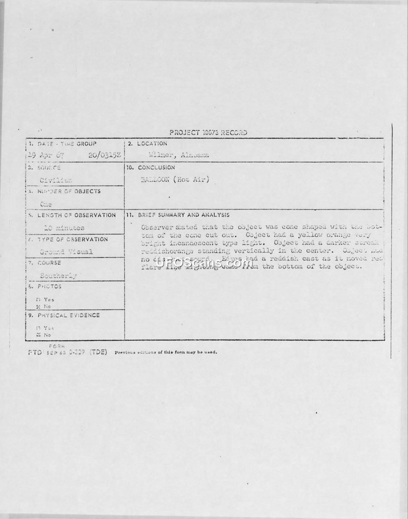 A 1967 sighting report from Wilmer, Alabama, describing a cone-shaped object with yellow-orange lighting. The Air Force concluded the object was a hot air balloon.